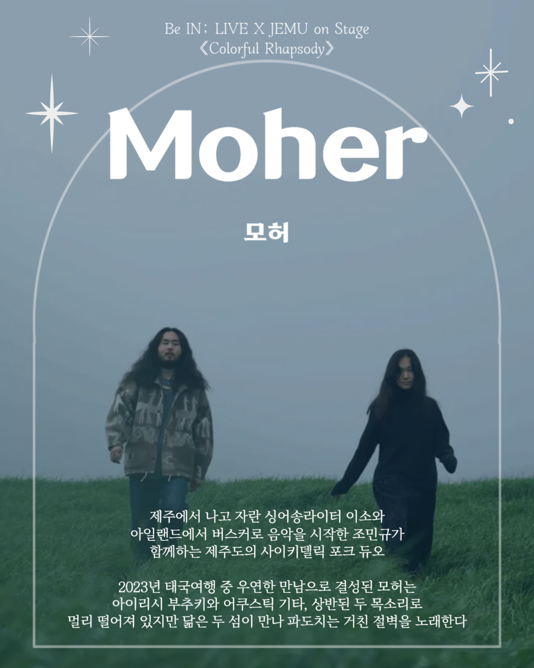 빛깔 다른 4팀의 라이브, 하나의 무대에서 폭발하다! 아이리시 부주키와 어쿠스틱 기타, 상반된 두 목소리가 만나 제주와 아일랜드 두 섬의 정서를 노래한다. 2024년 데뷔 앨범 [만화경]을 통해 몽환적인 음악 세계를 펼쳐냈으며, 2025년 제22회 한국대중음악상 최우수 포크 음반 부문을 수상했다.