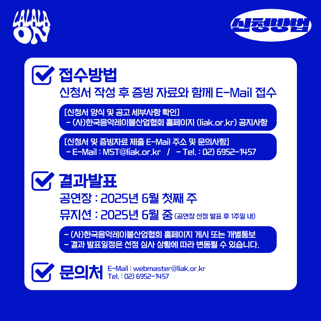 | 첨부2 | [LIAK] 2025 라라라온 - 뮤지션 모집 공고문.pdf (168 KBytes) | ||