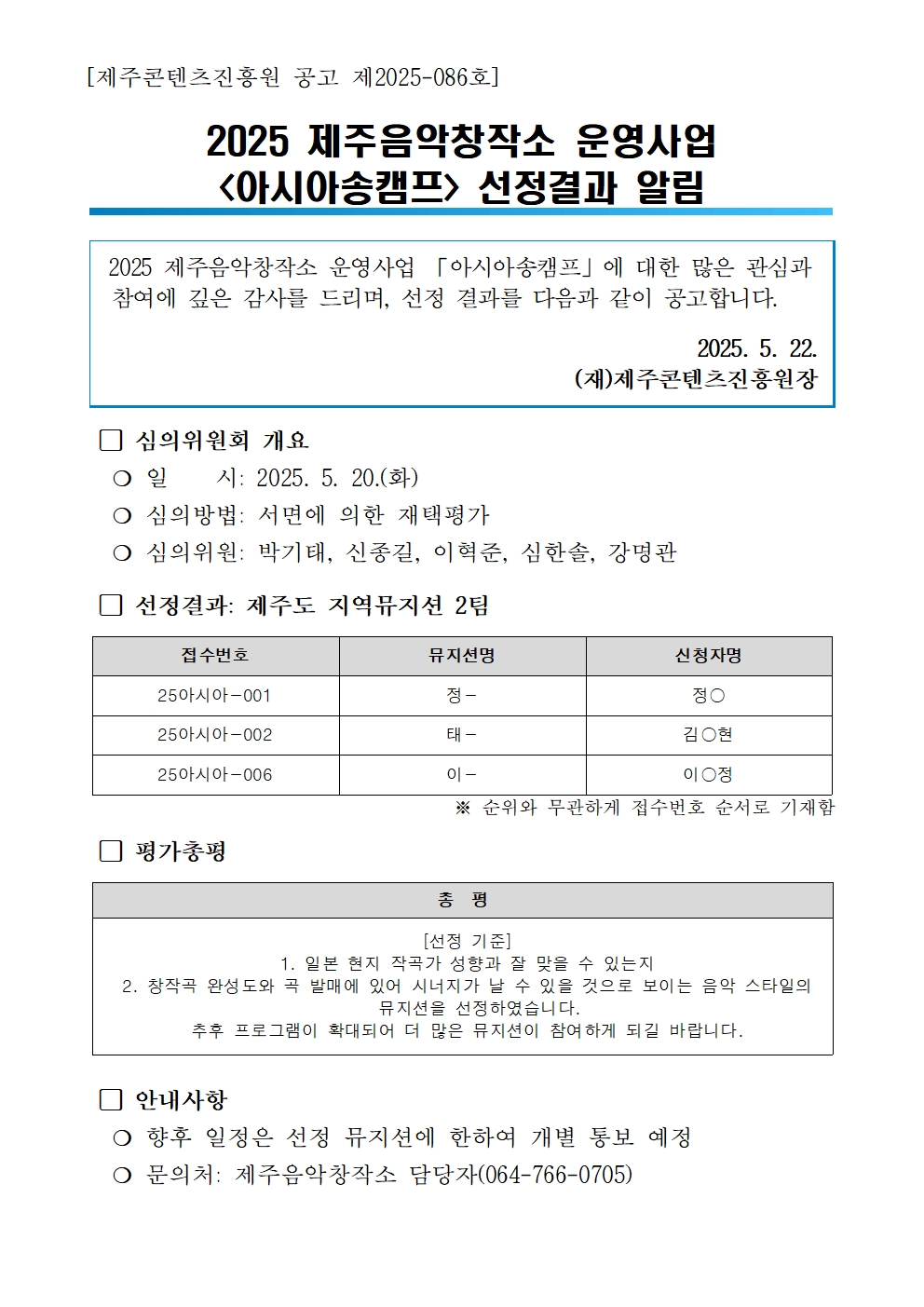 2025 제주음악창작소 운영사업 <아시아송캠프> 선정결과 알림 게시물 상세보기