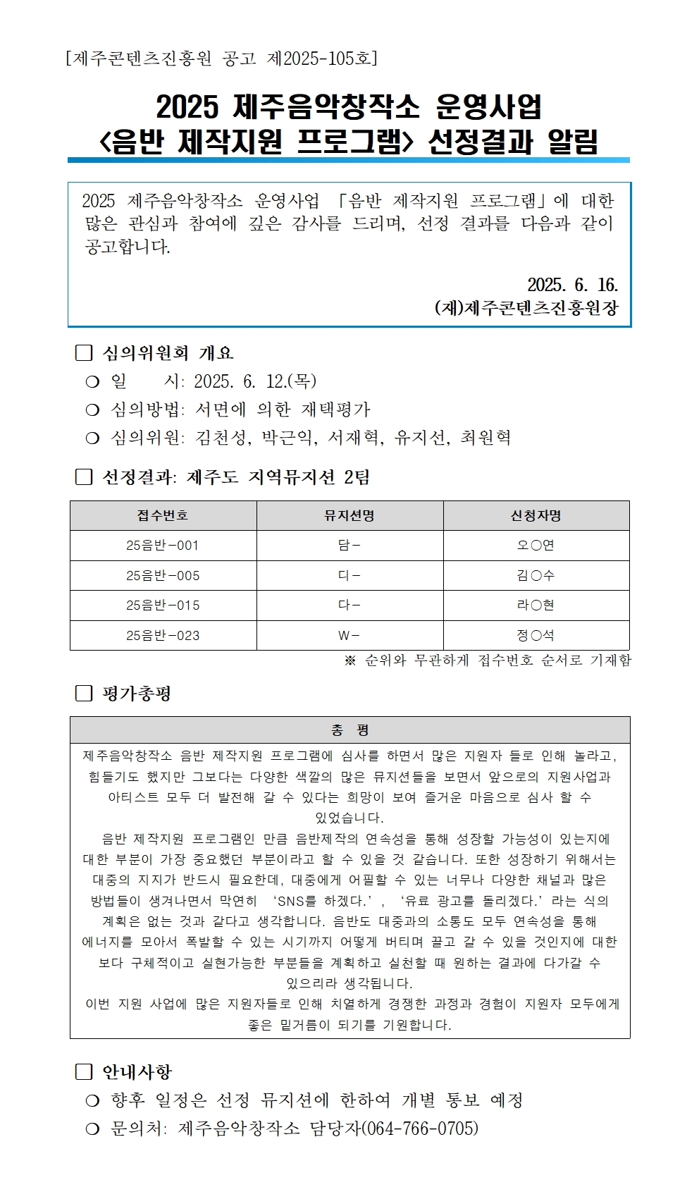2025 제주음악창작소 운영사업 <음반 제작지원 프로그램> 선정결과 알림 게시물 상세보기